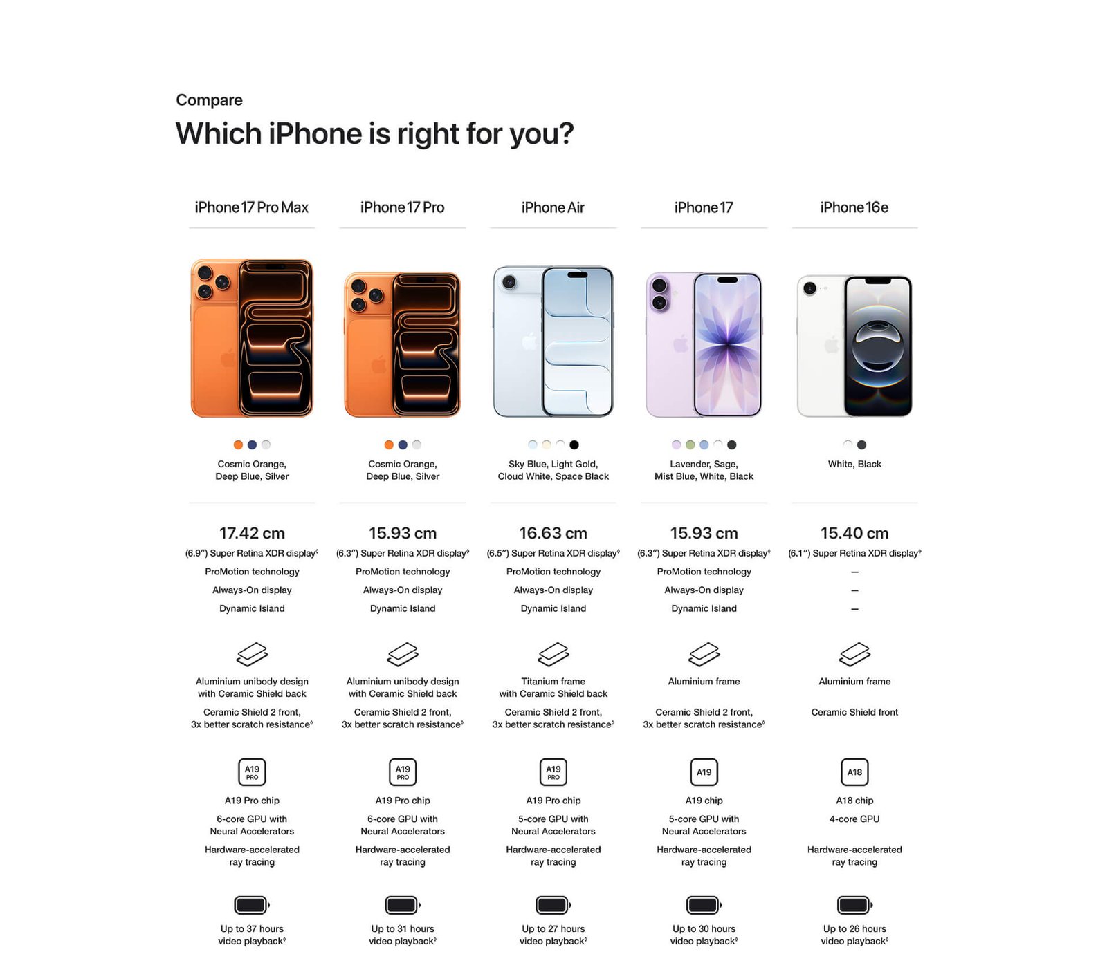 - 1The display has rounded corners that follow a beautiful curved design, and these corners are within a standard rectangle. When measured as a standard rectangular shape, the screen is 15.93 cm / 6.27″ (iPhone 17, iPhone 17 Pro), 16.63 cm / 6.55″ (iPhone Air) or 17.42 cm / 6.86″ (iPhone 17 Pro Max) diagonally. Actual viewable area is less.